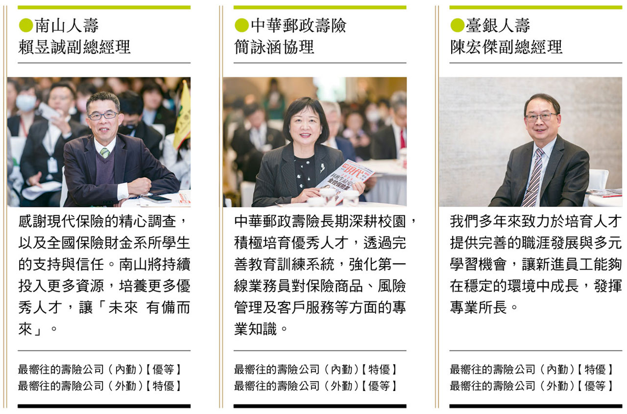 「全國大學保險財金系所學生就業意願問卷大調查」是由《現代保險》雜誌接受現代保險教育事務基金會委託執行,由年輕學子票選出最受青睞的保險與金控公司,成為業界徵才的重要參考指標。