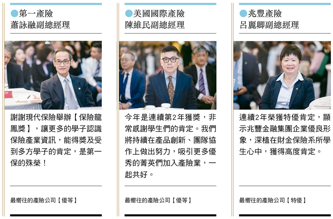 為了表揚最受年輕學子青睞的保險與金控公司,現代保險教育事務基金會依票選結果頒發【保險龍鳳獎】特優及優等獎座,涵蓋四大類獎項──「最嚮往的壽險公司(內勤)」、「最嚮往的壽險公司(外勤)」、「最嚮往的產險公司」及「最嚮往的金控公司」,今年共有十五家壽險公司、十三家產險公司及十家金控公司獲得此項榮譽。
