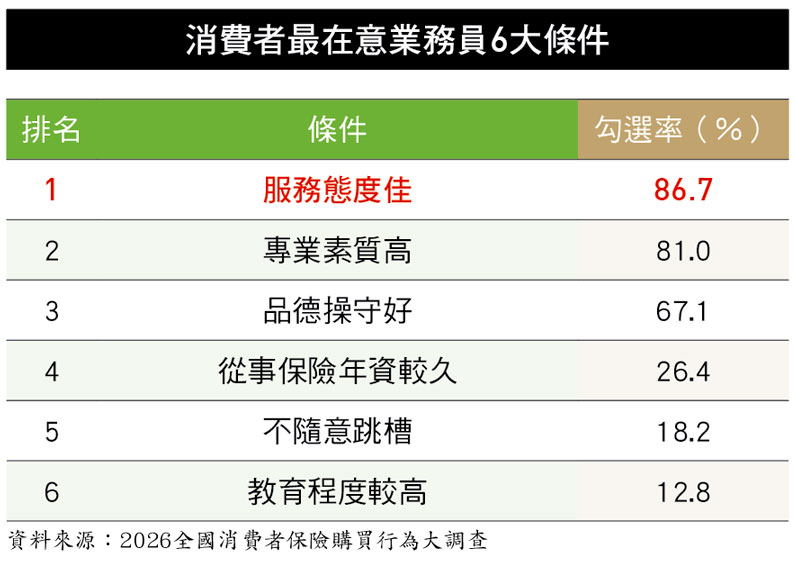 其次,是保險公司業務員的「長期陪伴感」。調查顯示,超過4分之1的消費者認為,「從事保險年資較久」是推薦業務員的重要條件,尤其對於預算有限或低年薪族群來說,年資久、穩定的業務員更能贏得他們的信賴。一般來說,保險公司業務員流動率較低、在同一家公司任職的時間較穩定,對於消費者來說,專業穩定的服務溫度、以及售後理賠的長期協助,是他們在投保管道選擇時,相當在意的關鍵原因。