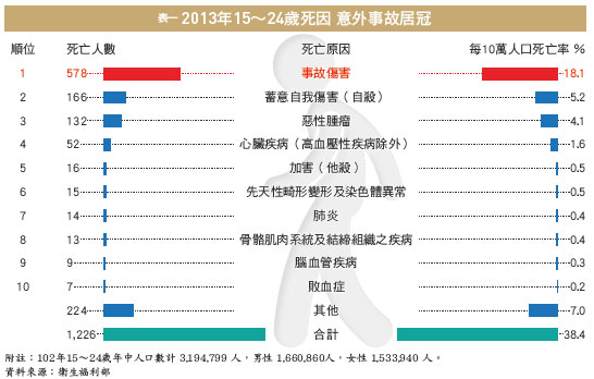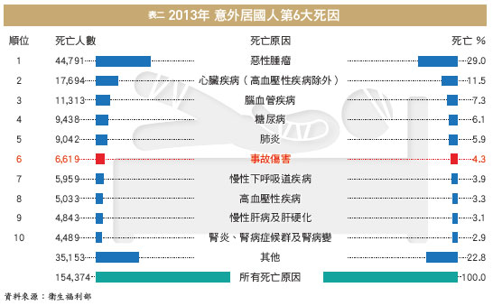 雖然國人第一大死因連續三十二年來都以癌症居首,但若論年輕人的奪命殺手則非事故傷害莫屬,因而意外傷害也是造成國人平均生命損失年數最慘重的原因。