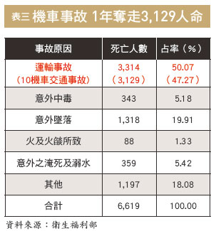 意外事故亦居全台第六大死因,在所有意外身亡者當中,不滿六十五歲者就占了占六十%,共有三九四七人。