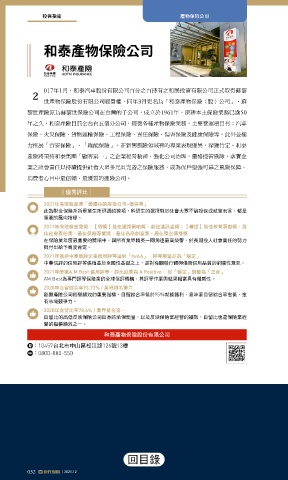 年之久。和泰產險目前全台有五個分公司,經營各種產物保險業務,主要營運項目有:汽車