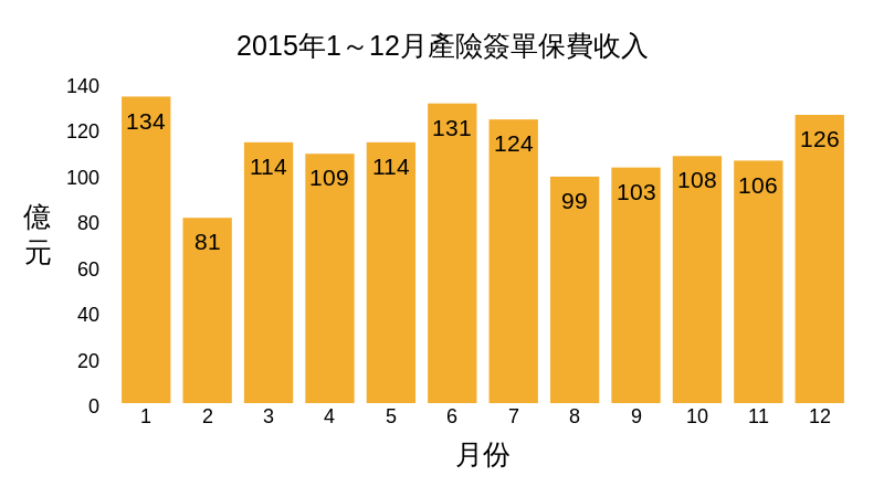 新車銷售急拉尾盤,車險保費大幅進帳,讓去(2015)年12月產險簽單保費成長率創下全年最高的6.4%。總結去年全年產險保費收入1,353億,較去年成長2.9%,距離年度成長6%的目標僅達成一半。