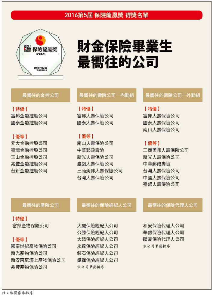 今(2016)年將有3千多名學生從39所設有財務金融、財務資訊、精算、風險管理、保險等學系與研究所的大學畢業,哪些金控、產險公司、壽險公司與保險經紀人公司、保險代理人公司最獲科班應屆畢業生青睞?