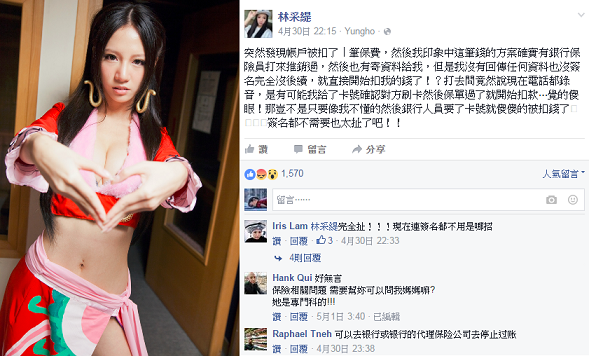 以模仿暢銷漫畫「海賊王」蛇姬一角一炮而紅的性感女星林采緹,近日在Facebook發文抱怨,表示接到電話行銷保險,但「什麼文件都沒簽名」,保單就通過開始扣款,讓她大感不滿,覺得還會有許多人因此「受騙」。到底電話行銷的合法程序為何,又投保過程中一個字都不用簽合理嗎?