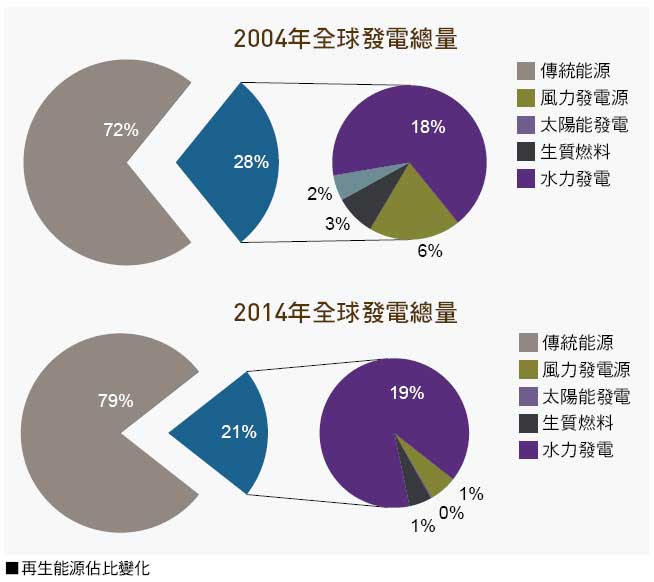 摩根投信總經理尤昭文分析,再生能源近年已有大幅成長;市面上再生能源種類多元,包含風力、太陽能、水力、地熱能、生質能源等,但除了已臻成熟的水力發電,目前僅風力與太陽能較隨著近年綠能技術快速發展。風力發電與太陽能發電設備成本已大幅下降,雖然仍不及燃煤、天然氣等能源便宜,但已能吸引廠商投入意願。政府也提供設備補貼及保證電價,讓業者能更準確地估算10~20年內的收益。
