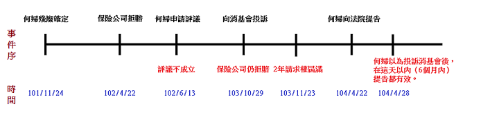 何婦於民國101年11月24日因意外事故確定殘廢,向2家投保的公司請求理賠,但其中一家拒賠,隔年6月,何婦向金融評議中心申請拒賠公司的評議,結果評議不成立,在友人的建議下,103年10月再向消費者文教基金會申訴,依然未果,最後於104年4月22日才向法院提出告訴。
