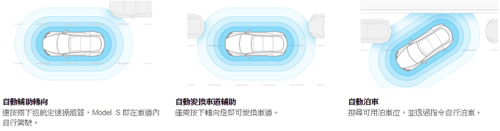 Tesla於官網中介紹,model S 搭載的自動駕駛系統(Autopilot),可主動管理車速,具有煞車及轉向功能可避免碰撞,並防止偏離道路,此外,系統結合GPS和數位地圖,可帶領車輛行駛在走走停停的車陣中,且保持正確方向。