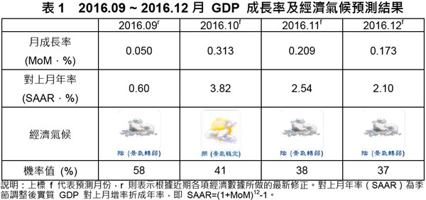 1.2016「保1」,2017「望2」有難度:第二季GDP季增率轉正,7月景氣燈號再現綠燈,出口也連續2個月正成長,符合我們6月時的預期。研判第三、四季成長動能持續微幅向上,經濟衰退機率平均僅約10%,故我們維持2016年的經濟成長率預測值0.8%。展望2017年,國內重大議題(兩岸、勞工、年金等)複雜度高,恐壓抑民間消費與企業投資,全球經濟復甦的不確定性大,輸出成長恐難突破3%,加上民眾經濟信心改善幅度趨緩,本團隊首度預測2017年台灣經濟成長率為1.2%,預測區間為0.5%~2.0%。