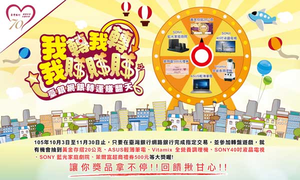 自105年10月3日起至同年11月30日舉辦 「我轉我轉 我賺賺賺」網路活動。活動期間客戶只要在網路銀行完成一筆指定交易,就可以參加轉幸運輪抽大獎的活動,可獲得一次拿大獎的機會,交易次數愈多,中大獎機會愈大喔!