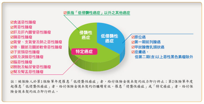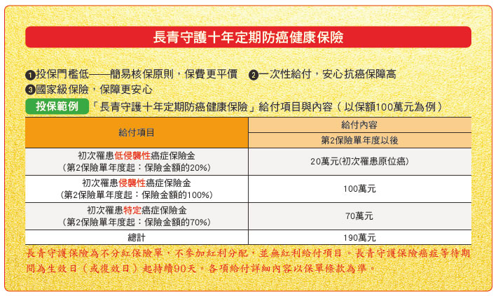 若投保「長青守護保險」自第2保單年度起,只要病人確定罹患低侵襲性癌症(原位癌),即可理賠保額的20%,而且保單仍持續生效;若確定是惡性腫瘤,且為11種特定癌症,不但能領回保額的100%,還可以加領保額的70%,投保100萬元,最高可以領回190萬元。