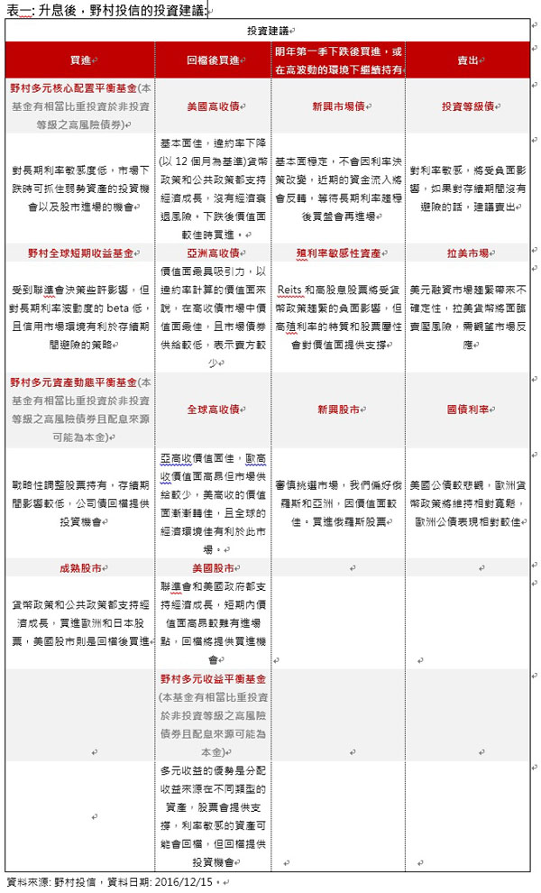 美國聯準會今日12月15日凌晨三點公佈升息一碼,符合野村投信周一針對市場之預期。野村投信認為,聯準會此次偏向鷹派的預期考量了對川普積極新政下、能夠幫助經濟走向成長和拉抬通膨的看法。聯準會並表示近期的經濟緩和擴張,但通膨已經明顯提升。而野村投信也建議投資人不妨加碼多元資產型基金、短債和成熟市場股票;或回檔後可加碼買進美國、亞洲與全球高收債券及美國股票(見表一)。