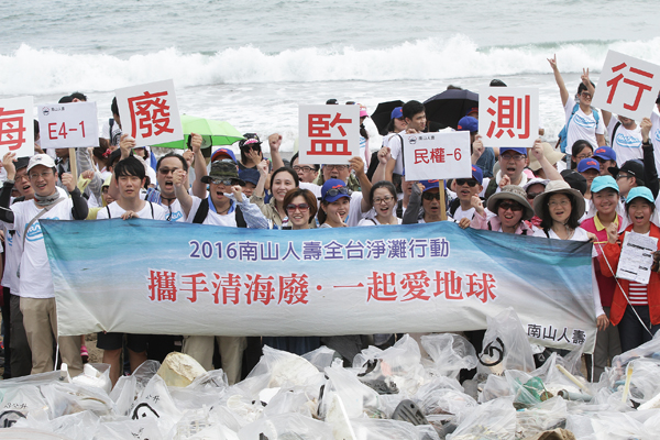 南山人壽除了以築籬固沙方式作為守護海岸線的主軸外,每年也在全台各地舉辦淨灘活動,今年度與七星生態保育基金會、台灣環境資訊協會、桃園縣環境保護協會、台南市北門社區大學等專業環保機構合作,舉辦7場淨灘活動,號召近6,000位南山義工及親友,在北海岸萬里下寮及頂寮海灘、桃園永安漁港北面海岸、台中大安港附近海灘、台南七股潟湖附近海岸,以及高雄旗津海灘等七個地點,完成逾16公里海岸的淨灘任務。同時,南山人壽更響應ICC(International Coastal Cleanup)國際淨灘行動的海洋廢棄物監測行動,進一步將撿拾的垃圾作詳細分類與監測記錄,其中包含免洗餐具、塑膠容器、塑膠袋、菸蒂、打火機等其他廢棄物,以及漁業與休閒釣魚,總計清出近8.5萬件各式廢棄物,總重量逾11公噸,以實際行動守護台灣美麗的海岸生態。
