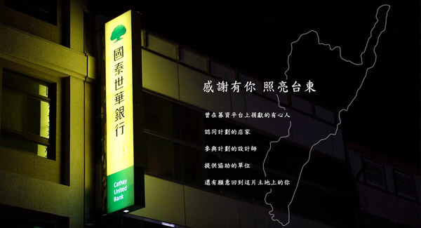 2016年尼伯特風災重創台東,造成當地經濟受創、家園毀損,據台東市政府統計,整體災損超過新台幣40億元 ,台東市七天清出來的垃圾量高達6,600噸,突顯當地民眾對於家園、城市重建的迫切需求。國泰世華銀行默默關注同樣在意「招牌」價值,貫徹服務熱誠的大小企業,主動贊助「台東街角名片計畫」,投入新台幣逾120萬元,協助當地26家商家重建招牌。國泰世華銀行台東分行的同仁,更逐一拜訪參與「台東街角名片計畫」的商家,提供商家相關金融服務與諮詢,用一步一腳印的方式落實「永續國泰、與鄰常在」的集團精神,成就社會共榮的願景。