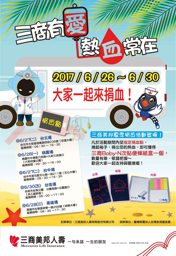為了讓捐血一袋、救人一命不再只是口號,三商美邦人壽與台灣血液基金會共同合作,「三商有愛 熱血常在」夏季捐血活動,將在6月份於台北、桃園、台中、台南、高雄共五處接力登場,為了鼓勵社會大眾積極參與,凡6/26~6/30到指定捐血點捲起袖子,捐出熱血者,即可獲得該企業提供的「三商Boby–N次貼便條紙盒」乙個,數量有限,送完為止。
