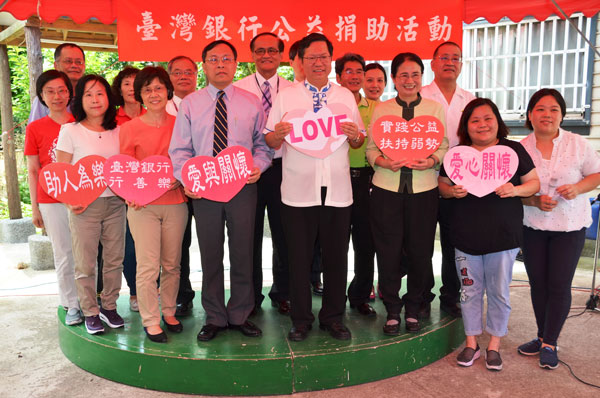 臺灣銀行踐履企業社會責任,又增添一頁溫馨而和諧的篇章。該行董事長呂桔誠特別選在7月1日周末休假日,邀請桃園市長鄭文燦指導並共同主持公益活動,並親自率同相關同仁,前往財團法人桃園市藍迪基金會附設桃園市私立藍迪兒童之家關懷院童,並捐款供該院執行「家童樂器及小家家具添購計畫」。該育幼院院長李雪櫻對於鄭市長及呂董事長親自到訪及經費贊助表達由衷的感謝,並代表全體院生致贈感謝狀感謝臺灣銀行的愛心捐助。