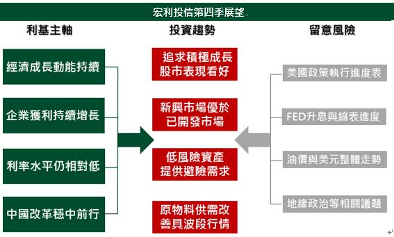 進入2017年最後一個季度,全球景氣仍維持溫和復甦,美歐之貨幣政策亦料將陸續由寬鬆轉向逐步緊縮,以資產類別而言,由於聯準會採「先縮表、緩升息」策略,中長期整體風險性資產波動風險較低;在追求報酬積極成長的需求下,第四季股市表現看好。而在美歐貨幣政策轉變下,市場波動有可能加大,能夠承受市場波動衝擊的高品質資產,愈趨成為市場資金追逐焦點;相較於成熟市場,新興市場的經濟成長相對強勁,特別是亞太市場,資產品質較佳,企業獲利成長動能亦優於成熟市場,具有投資潛力。