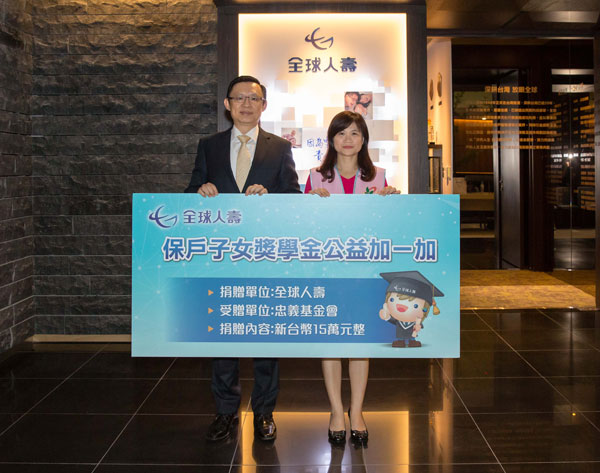 為了鼓勵莘莘學子努力向學,全球人壽舉辦保戶子女獎學金活動已邁入第六年,為展現公益關懷精神,傳達「因為愛 責任在」的品牌精神,除了延續去年新設立的保戶遺屬組獎學金,全球人壽於106年度新增設「公益加一加」活動,獲獎者若選擇捐出獎學金的10%給公益團體忠義基金會,全球人壽亦同步捐出相同金額給忠義基金會的失依兒,以協助失依兒少教育經費,預計將捐出新台幣15萬元,並期盼藉此善盡企業社會責任,一起帶動學子愛心潮,讓愛照亮社會每個角落。