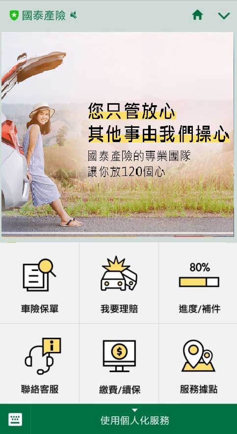 台灣車輛密度高,危險程度相對也高,車險已是多數車主或駕駛人必須擁有的基本標準配備,但在後續服務的部分,民眾往往因不熟悉車險內容而花費大把時間處理,國泰產險為了替忙碌的現代人解決這個困擾,除了既有的客服專線以外,同時建立「車險自助服務平台」及LINE等多項服務管道,客戶只需要使用智慧型手機上網,就可以隨時隨地從國泰產險官網取得車險相關服務。
