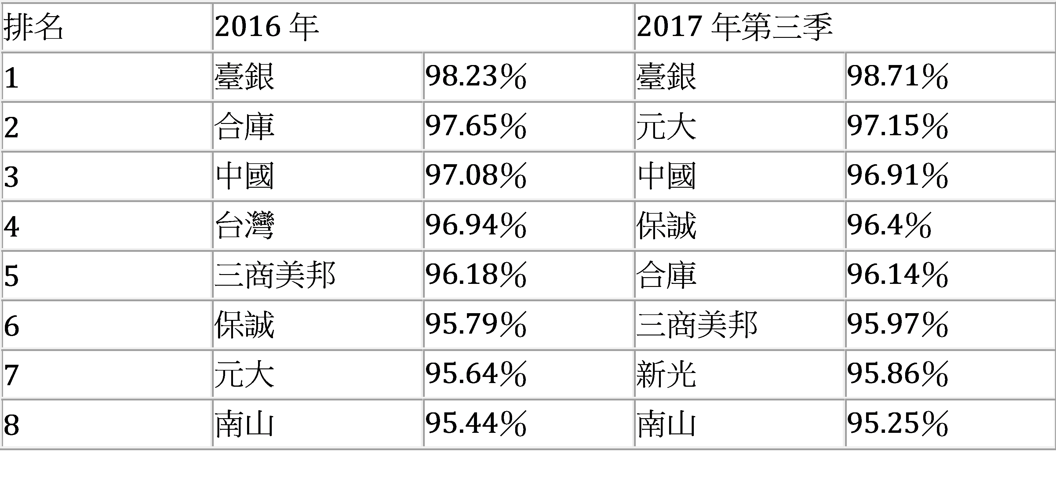 今年第3季的排名略有變化,僅新光以成長1.4%(2016年為94.46%)的成績擠進前8強,其餘7家都是老面孔,其中臺銀已連續數年拿下繼續率冠軍寶座,今年第三季更創下98.71%的佳績,繼續率直逼百分百。