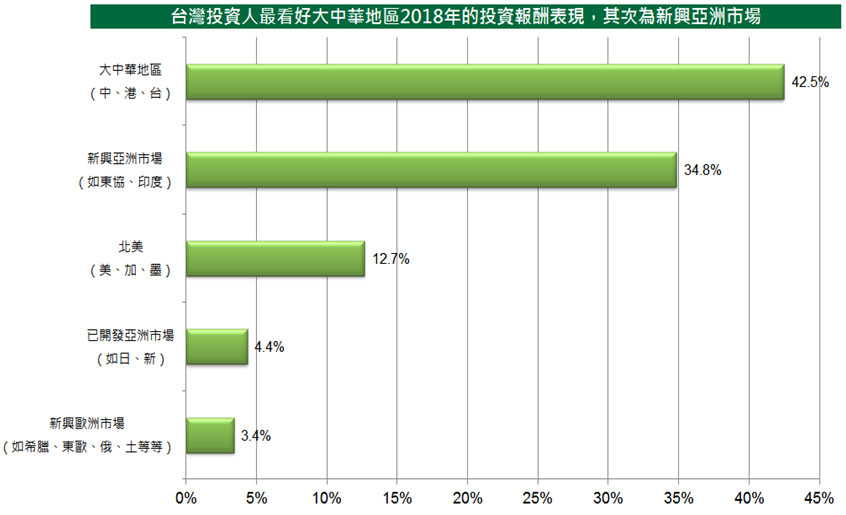 而至於台灣投資者的看法,則是明確看好股票市場的報酬表現。根據宏利投信於11月份進行的「2018年投資展望」線上調查顯示,有超過46%的台灣投資人認為2018年的股市投資報酬會較佳,33%的投資人則認為股債表現旗鼓相當。至於看好的區域市場,則是以大中華地區最為看好,偏好度達42.5%,其次則為新興亞洲市場佔34.8%,包括印度、東協等地。