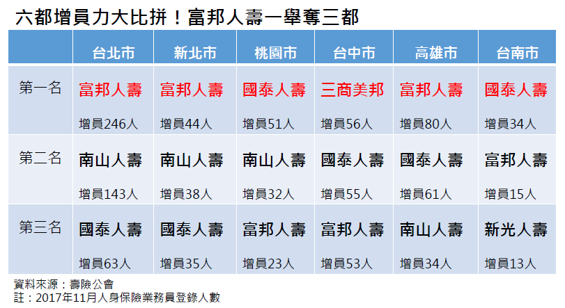 另外三都,則由其他壽險公司搶下。國泰人壽在桃園市、台南市的增員力全台最高,三商美邦人壽則拿下台中市增員王的寶座。