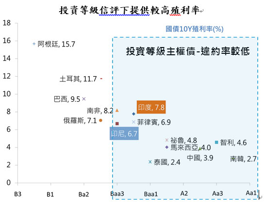 根據2017年IMF研究資料庫顯示,新興亞洲自2015年以來為全球經濟成長主要動能來源,年平均達6%以上的經濟成長率,遠高於主要工業國家(G7)、拉丁美洲、中東北非及新興歐洲等區域,未來三年的經濟成長預測也同樣顯示出新興亞洲仍為全球經濟成長的主要動能。而細看新興亞洲成員,印度更為其中的佼佼者,未來三年預期均有7.4%以上的經濟成長,印尼也不遑多讓,平均每年也有5.5%的經濟成長。謝秀瑛認為,以殖利率角度而言,以新興國家10年期國債殖利率當比較基準,然後以主權債信評等區分投資等級及非投資等級,可以看出在投資等級主權債行列中,印度、印尼提供最高之殖利率,分別為7.8%、6.7%。
