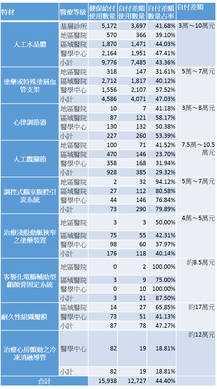 目前開放自付差額特材包括:調控式腦室腹腔引流系統、塗藥血管支架、心律調節器、特殊功能人工水晶體、耐久性生物組織心臟瓣膜、淺股動脈狹窄之塗藥支架、陶瓷人工髖關節或金屬人工髖關節、義肢、客製化電腦輔助顱顏骨固定系統、治療心房顫動冷凍消融導管等10項。