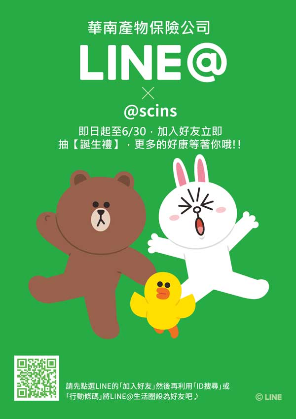 隨著台灣民眾在line的月用戶數已成長至1,900萬,為延伸消費者更便捷的服務,華南產險「Line@官方帳號」已於本(6)月1日正式上線,同時為慶祝公司成立55周年活動,推出凡加入Line好友可抽加入見面禮之外,若透過連結至華南產險eCover商務網線上投保者,還能參加最高價值42,000元百貨禮券抽獎活動,輕鬆享好康!