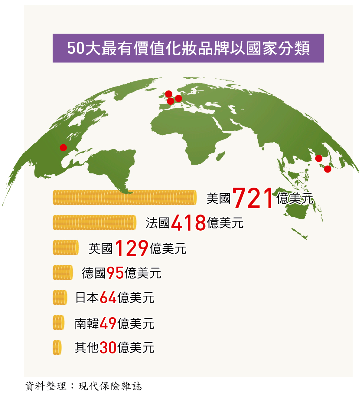 有趣的是,從品牌所屬國家來觀察,美國品牌占最大宗,韓國品牌地位則逐漸爬升。五十大品牌總價值一五○六億美元,其中屬於美國的品牌就占四十八%,法國以二十八%次之,其餘英、德、日、韓等皆占個位數。