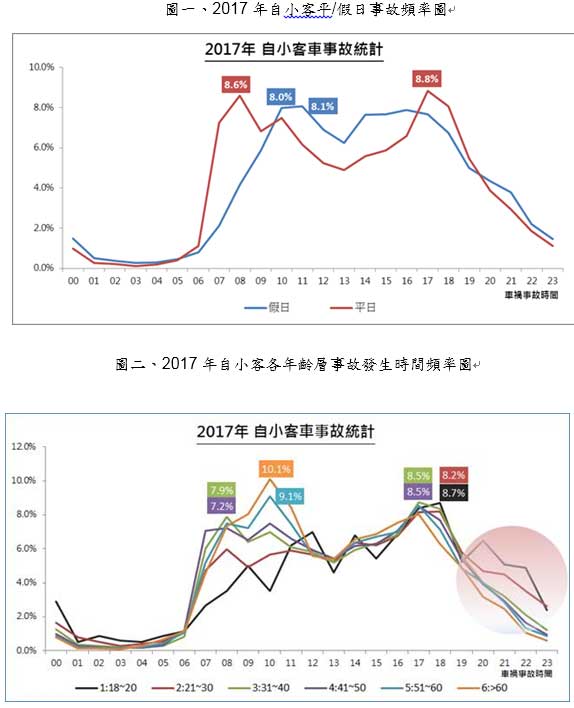 進一步分析各年齡層發生事故的時間,可發現不同年齡層的人因生活型態的差異,事故發生的時間也不同。一般上班族(31-50歲)的事故時間集中在上、下班的兩個尖峰時段,退休族(51歲以上)則是發生在早上9點到12點之間。年輕族群(18-30歲)的事故發生頻率高峰在晚間20點過後,為同時段其他年齡層的2倍;同時年輕族群的肇事率從20點至翌日6點都維持在眾年齡層之冠,顯示該族群的事故發生率與夜生活型態有正相關。