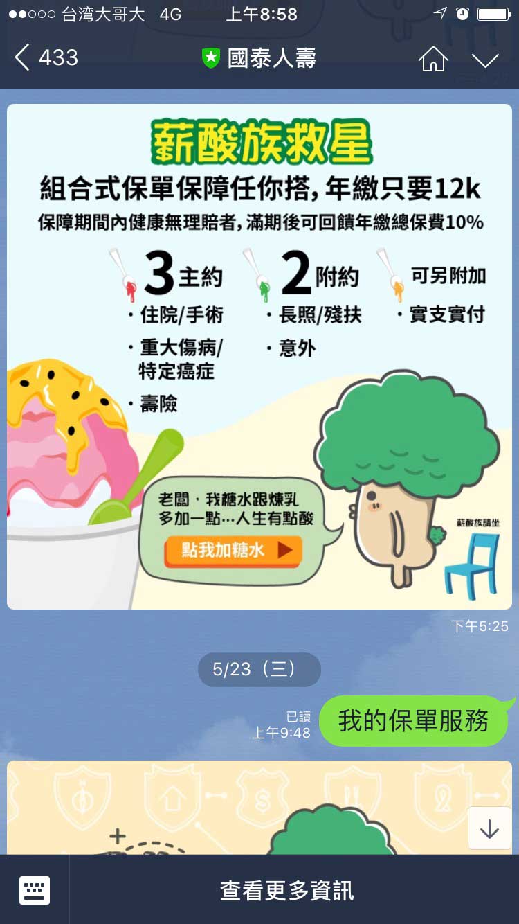 國泰人壽LINE官方帳號不久前(5/8)正式上線,不少人一定發現了「樹寶」這個秘密武器,悄悄地在LINE上面跟大家「玩」了一個多月,而這短短一個月即快速累積168萬好友,打破保險業紀錄!國泰人壽深知年輕族群較不懂保險商品的痛,巧妙運用樹寶這個角色,以詼諧、輕鬆、有點厭世的角度切入保單規劃新手的痛點(如薪酸族救星),將枯燥生硬的保險商品轉化成簡單易懂、引發共鳴的圖文訊息,成功吸引2倍好友點擊互動,顛覆了過去認為保險商品行銷內容較生硬、嚴肅的印象。