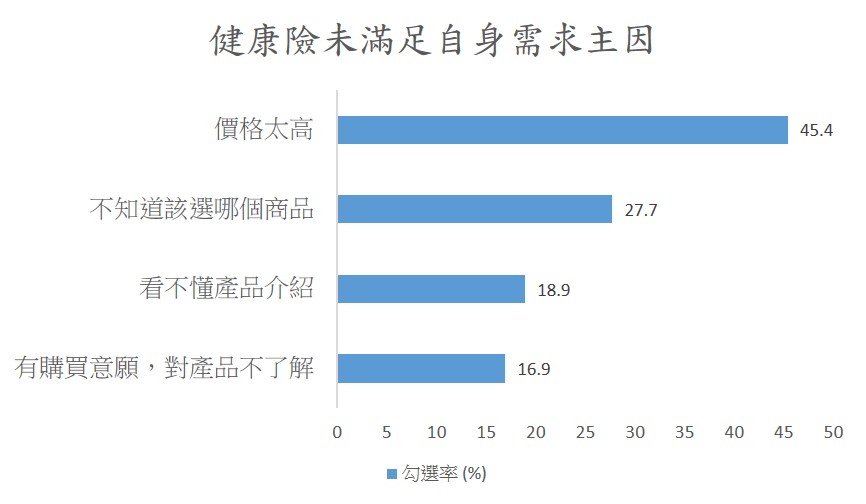 為何難下定決心買保險?有45.4%受訪者直指「價格太高」,而有27.7%表示「不知道該選哪個產品」、18.9%「看不懂產品介紹」、16.9%「有購買意願,對產品不了解」。透露出除了經費的考量外,保險內容複雜、缺乏可靠資訊等因素,讓民眾不敢亂花錢買不熟悉的商品。