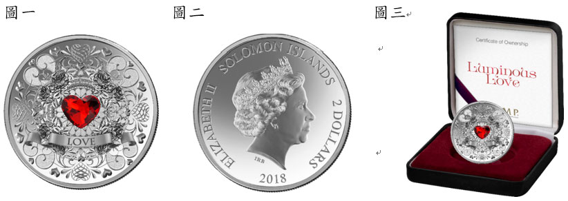「璀璨的愛」紀念銀幣,由瑞士PAMP鑄幣廠鑄造,重量1英兩,含銀成色千分之999,銀幣正面刻劃英國女王伊莉莎白二世側面肖像、發行年份(2018)、國名(SOLOMON ISLANDS)及面額(2 DOLLARS),全球限量發行1,000枚,本行首批獲配100枚。
