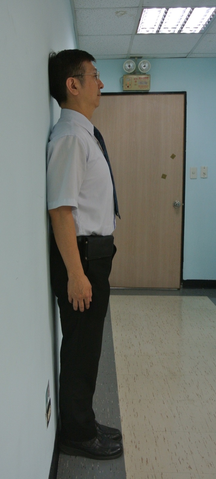 3. 靠牆站立:不曉得正確姿勢該怎麼做,可靠牆站立,將頭、頸、背部往後貼近牆面並收下巴,持續5分鐘左右,每天至少1次,站久了自然能站挺。