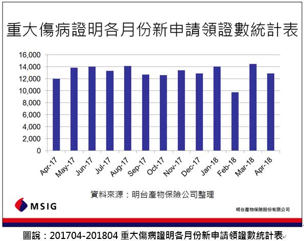 明台產物保險公司進一步說明,根據健保署資料,截至2018年4月,國內重大傷病累計有效領證數已達955,601張,過去一年平均每月新申請發證數約13,000張,重大傷病險則提供這些家庭的醫療費用安心的保障。產險公司的健康險保單具有單獨投保且免體檢的優點,不用併同其它壽險保單同時投保,因此投保費門檻低。惟依照法令目前產險公司僅能銷售三年以內的短期保單,被保險人擔心保期內體況變化而無法順利續保,是目前產險業健康險銷售最大的瓶頸。因此本張重大傷病險特別設計自動續約條款,保單到期時不需要重新填寫告知事項,保險公司寄發續保通知、被保險人繳費後即可完成續保,在承保年齡上限前均可持續投保以避免保障中斷,故今年推出後大受歡迎、銷售呈現高度成長。