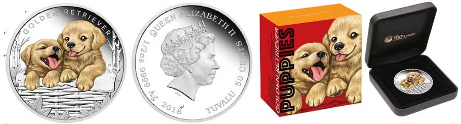 澳洲柏斯鑄幣局推出寵物狗彩色精鑄系列銀幣,以可愛的小狗作為主題設計,該行繼107年6月7日起陸續推出米格魯彩色精鑄銀幣及牧羊犬彩色精鑄銀幣之後,第三枚黃金獵犬彩色精鑄銀幣,也亮麗登場。溫馴充滿智慧的黃金獵犬,一直是受歡迎的寵物之一。黃金獵犬原本是為了狩獵野禽而培育的,喜愛接物,接回扔出去的棍子或球,可以讓黃金獵犬陪著主人玩上幾個小時都不膩。銀幣主題面描繪兩隻調皮的黃金獵犬幼犬,從籃子裡探出身來,萌萌大眼流露出嬉鬧愉悅的神情,讓喜歡毛小孩的您,愛不釋手,背景則是設計了主題文字「GOLDEN RETRIEVER」。