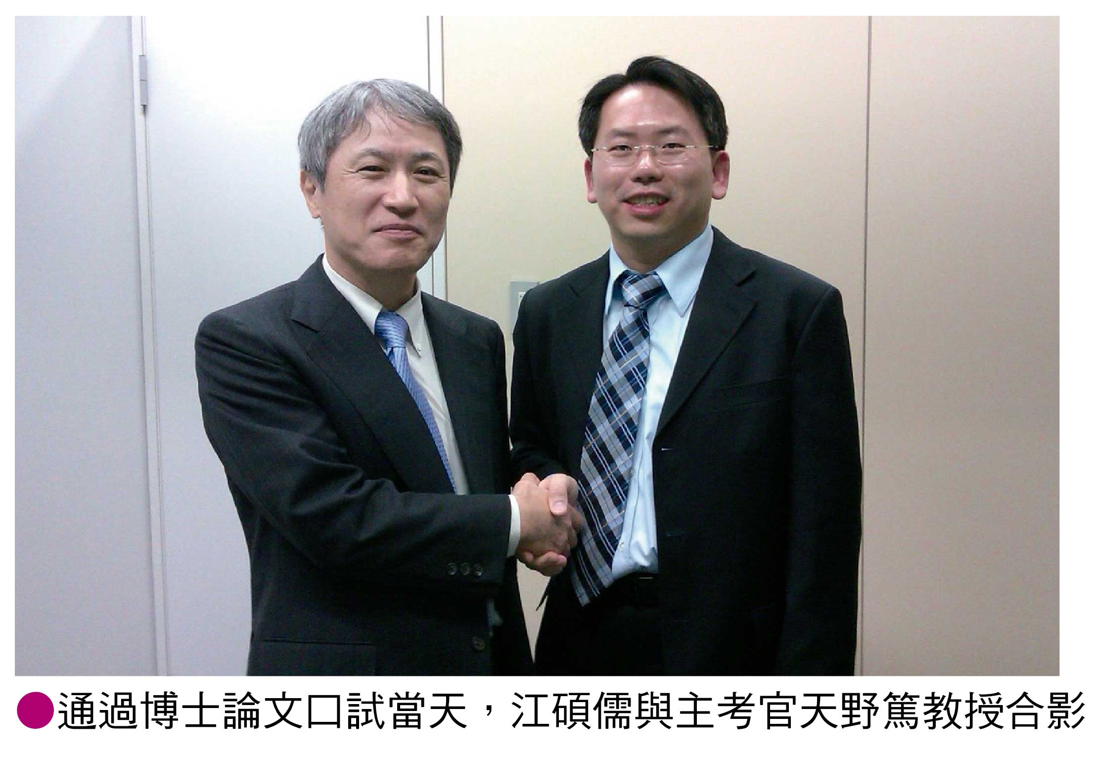 江碩儒是目前台灣心臟科唯一取得順天堂大學醫學博士的醫師,而這位日本家喻戶曉,享有「神的手」美譽的天野教授,正是江碩儒博士論文口試的主考官。江碩儒說,當初選擇順天堂大學進修不只因為該校學風自由,很歡迎外國研究人員,更因為心臟科是該校的強項。