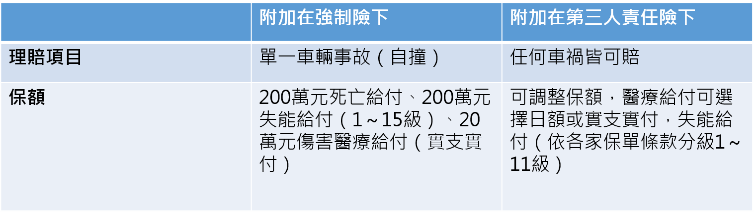 此外,強制險不賠「駕駛本人」。若因自撞發生的車禍,強制險無法理賠,駕駛人傷害險通常是附加險種,又分為「附加在強制險下」與「附加在第三人責任險下」兩種,對駕駛人的理賠範圍各異!