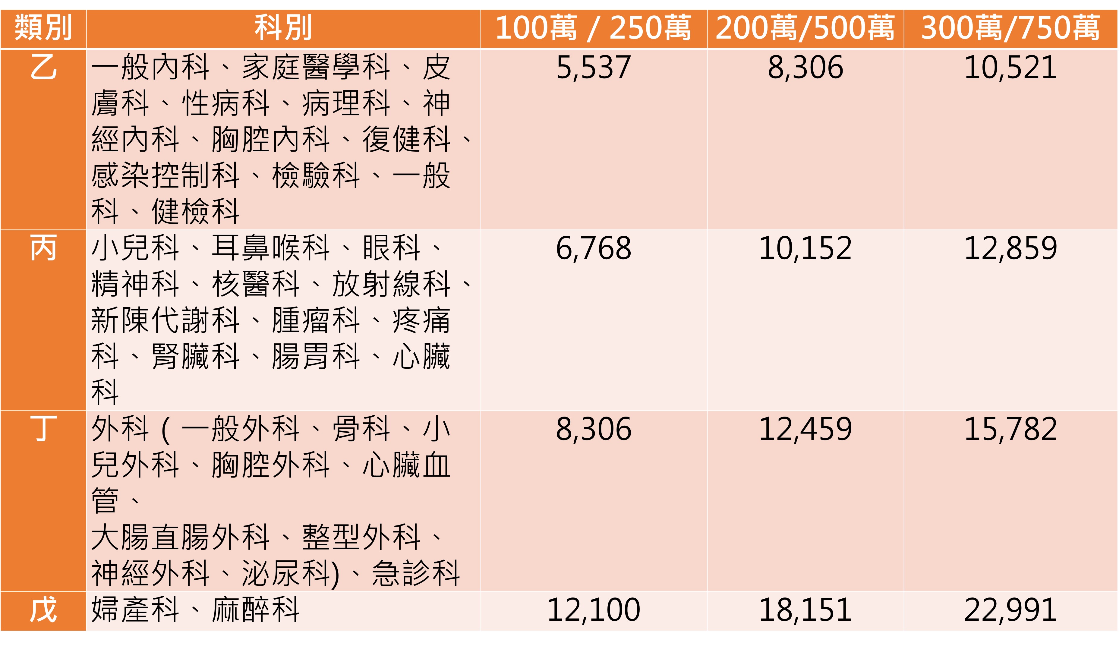 根據全聯會提供給醫師的費率參考表,以每次意外事故保額100萬元、累積保額250萬元的條件投保,根據科別不同,保費約在5,000~12,000元,此外,會根據損失經驗、年資、學歷、每日看診數、可用器材設備等因素加減費,最高加費125%,最低可打到7折。