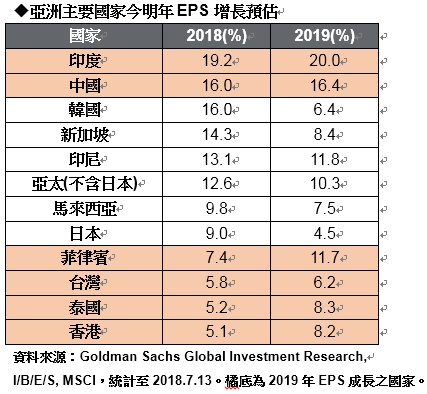摩根亞太入息基金產品經理張致寧指出,根據統計,今年高達6個亞洲國家的EPS能達到雙位數水準,進入2019年預估亦有5個國家能維持雙位數的成長力道,更重要的是,包括印度、中國、菲律賓、台灣、泰國、香港明年的EPS預估增長數字相較今年更為亮眼,有助於當市場回歸檢視基本面時,能提振亞洲股市表現。