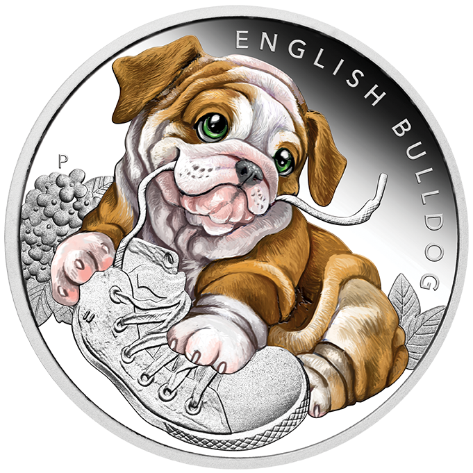 澳洲柏斯鑄幣局推出「寵物狗」彩色精鑄系列銀幣,以可愛的小狗作為主題設計,繼「米格魯」、「牧羊犬」、「黃金獵犬」之後,第四枚「鬥牛犬」彩色精鑄銀幣亮麗登場。鬥牛犬是世界上最具識別性的犬種之一,因其體型小巧和與生俱來的友善特質,近年來已風靡全球而倍受寵愛。銀幣主題面描繪了一隻英國鬥牛犬幼犬,玩弄著鞋子,意味著與主人的友好,帶著萌樣眼神期待一起玩樂嬉戲。幣面並標示英文名稱「ENGLISH BULLDOG」。