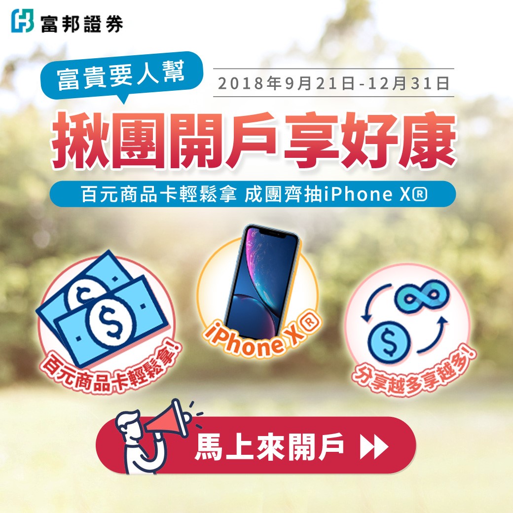 從未在富邦證券開過戶的投資人注意了,富邦證券隆重推出30周年最新鉅獻,即日起至12/31止舉辦「富貴要人幫 揪團開戶享好康」活動,來富邦證券線上開戶成功就送超商100元商品卡,證券交易成交不限金額,再獲超商100元商品卡,成為富邦證券客戶後,只要e指分享專屬開戶連結給親友,親友透過該連結完成線上開戶,並成交一筆證券交易(不限金額),您就可以再獲得超商100元商品卡,分享越多獎金越多,富邦證券表示,只要符合活動資格,完成開戶並交易之團員達十人,團主及團員都可享月月抽iPhone XR的機會,每月抽兩名,活動期間共六名。