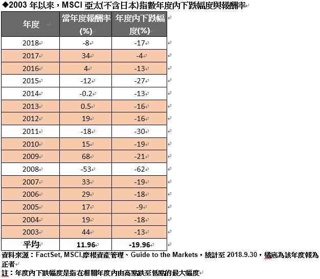 在強勢美元、中國貿易戰爭、中國弱勢等國際干擾下,今年亞股未能如前兩年繳出出色的表現,不過,摩根投信指出,回顧2003年以來,MSCI亞太(不含日本)指數即使遇到年度內曾發生下跌逾雙位數的狀況,但在基本面、資金面撐腰之下,仍有不小的機會能於當年度繳出正報酬;若投資人擔心現階段市場震盪機率提高,不妨以同時納入股債資產,且注重收益表現的亞太入息、亞洲平衡型等策略布局,以降低資產波動度。
