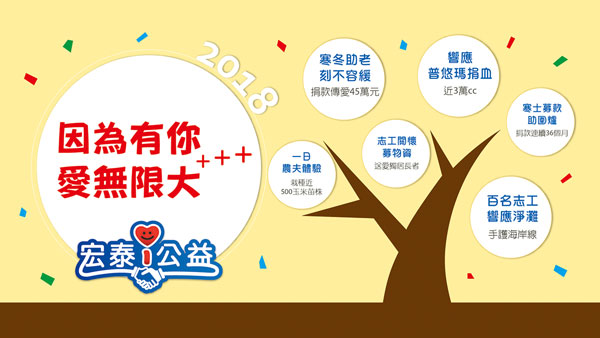 「宏泰i公益」志工團在宏泰人壽總經理湯維華的號召下已經成立6年了,「宏泰i公益」的建立目標希望員工身體力行一起投入公益活動,因此每次活動都是員工與家屬一起參加,次次皆獲得熱烈響應。2018年總共舉辦了超過十次的公益活動,今年志工人數佔全體員工的6成,人數更持續攀升中。
