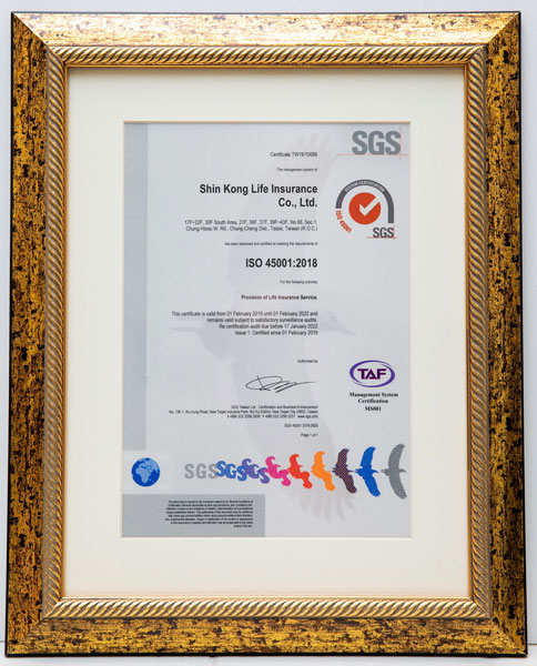 新光人壽致力提供員工舒適健康及安全的工作環境,期望讓全體同仁在工作上能夠安心、舒心,凝聚向心力,領先同業,成為第一個通過國際標準組織「ISO45001職業安全衛生管理系統」驗證的壽險業者,顯示新光人壽深植於公司文化中的職場安全衛生理念,備受國際肯定。