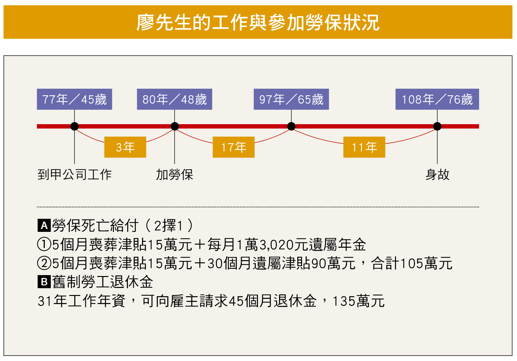 至於勞保老年給付,雖然廖先生已身故,但根據《勞保條例》第63條之1,家屬仍可改選一次請領老年給付,廖先生28年年資原本可領到41個月(前15年×1+後13年×2=41個月),但條例第59條第2項規定「被保險人逾60歲繼續工作者,其逾60歲以後之保險年資,最多以5年計,合併60歲以前之一次請領老年給付,最高以50個月為限。」因此,如果想改領老年給付,在廖先生28年年資中,只有65歲以前的17年年資才算,超過65歲的11年都不能計入,而17年年資只能領到19個月(前15年×1+後2年×2=19個月),比死亡給付的30個月還要少。