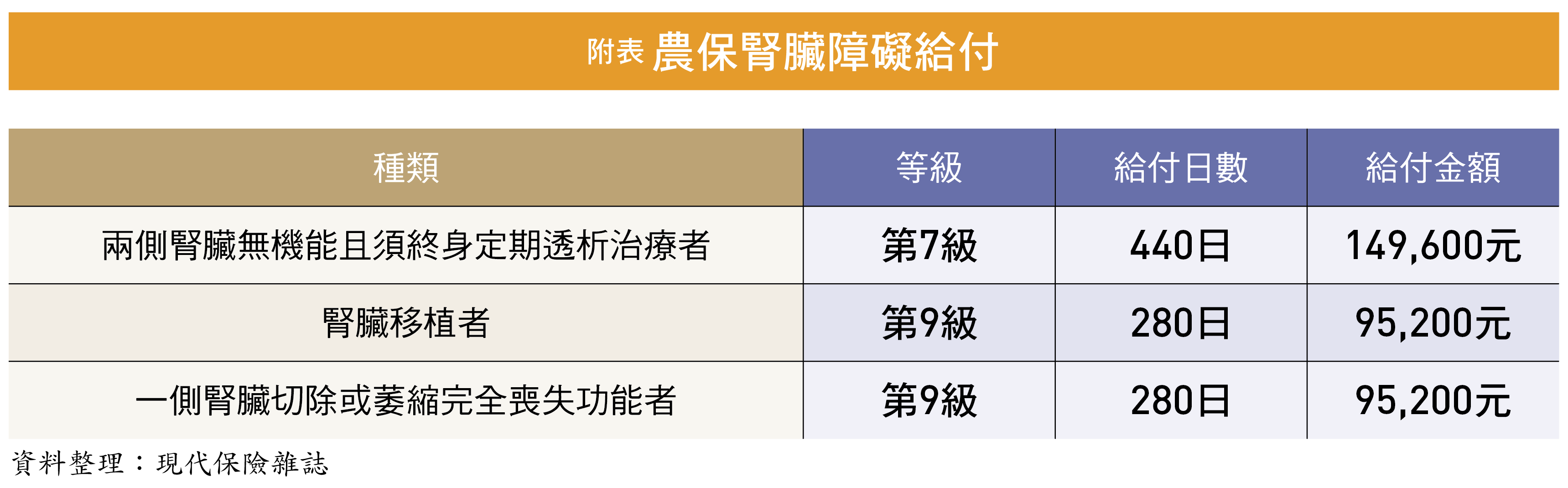 在12大身心障礙種類中,洗腎是屬於「胸腹部臟器障礙」,而腎臟障礙又區分為「兩側腎臟無機能且須終身定期透析治療者」、「腎臟移植者」及「一側腎臟切除或萎縮完全喪失功能者」3種,其中洗腎是屬於第7級障礙,可請領440日身障給付,後兩者都是第9級,可請領280日,依10,200投保金額計算,洗腎可領到14萬9,600元(10,200元×440/30=149,600元)、第9級則可領到9萬5,200元(詳附表)。