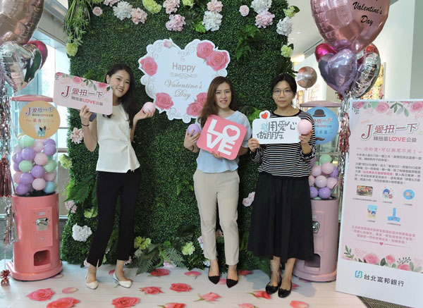 此外,今年為了讓愛更有意義,北富銀在台北市金融大樓一樓舉辦「J愛扭一下」公益活動(地址:台北市仁愛路四段169號),以「愛」為主題搭建植生牆與佈置地貼,一步入活動現場,如同走進盛夏的花園,一片綠意盎然中點綴著綻放的玫瑰;現場備有三台扭蛋機,分別為爸爸、單身族、戀愛ing專屬,8/9前凡投幣50元轉扭蛋,就有機會至知名高檔餐廳吃免費的情人節大餐、獲得北富銀J卡獨家小物,且北富銀將把扭蛋機所得全數捐給社福團體,希望在今年情人節,與客戶一同把愛傳出去,讓社會每個角落都能甜蜜在心頭。