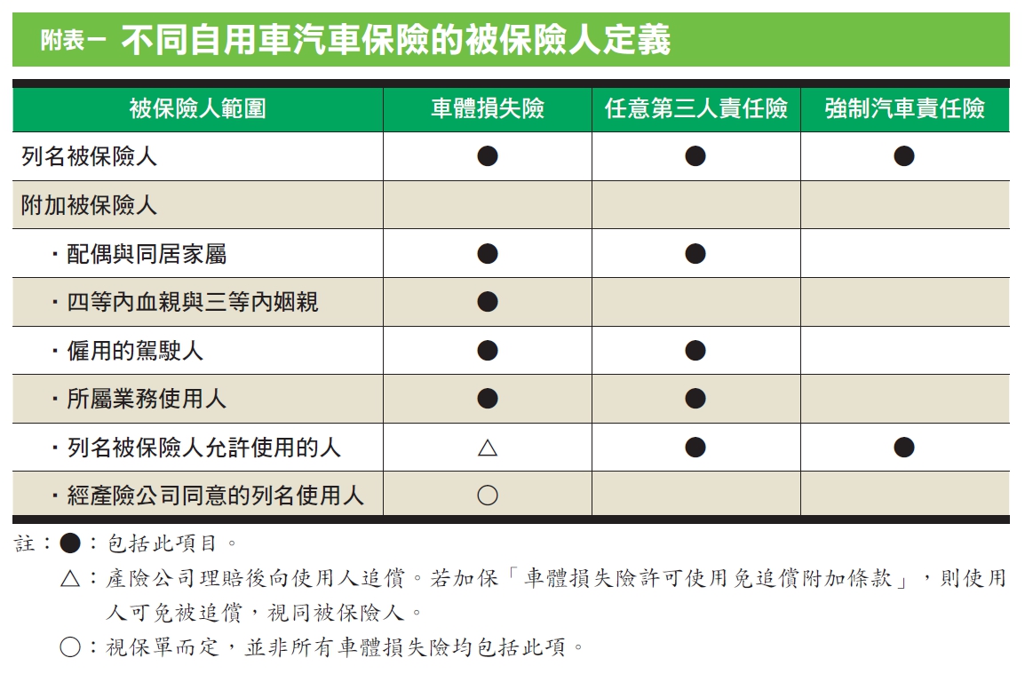 像一般車體損失險的附加被保險人包括配偶、同居家屬、四等內血親、三等內姻親、僱用的駕駛人和所屬業務使用人等,這一大群的關係人可能用一「拖拉庫」也載不完。不過,相較於其他汽車責任險,車損險少了一項最有彈性的規定,就是經列名被保險人允許使用的人(詳附表一)。